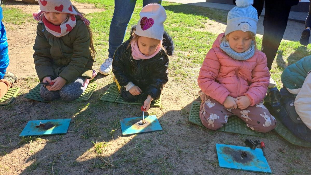Warsztaty prowadzone w lesie pozwalały dzieciom ubrudzić się, zmęczyć i wyszaleć, czyli to co najbardziej lubią. Miały możliwość pobyć w towarzystwie przyrody, dowiedzieć się wielu ciekawych rzeczy o życiu zwierząt. Uczyły się odróżniania roślin jadalnych od trujących. Wykonały przepiękne prace z naturalnych darów lasu. Grupa starsza miała możliwość rozpalenia ognia z wykorzystaniem krzesiwa.